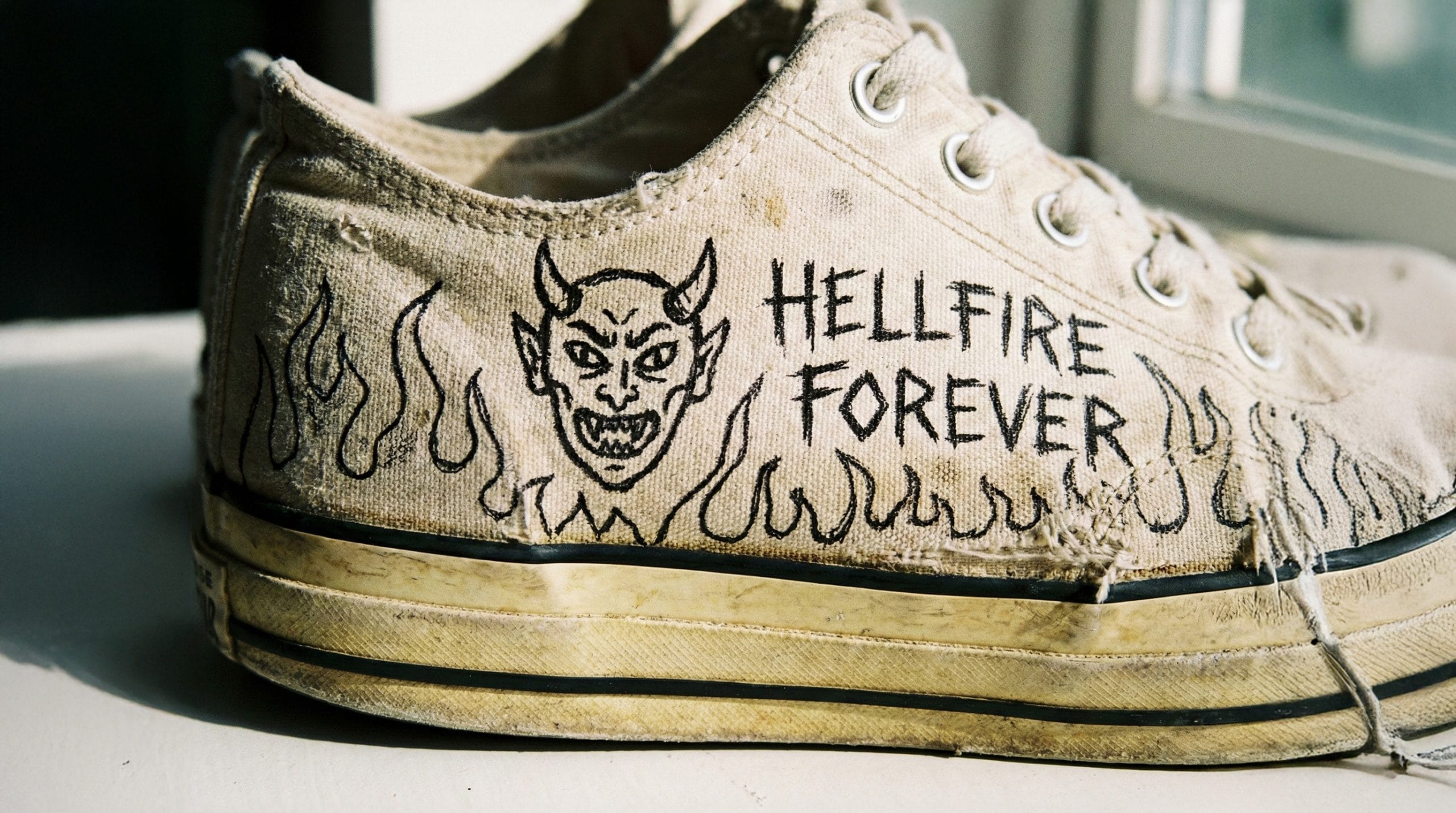 - Manuel Karalamalar: Ayakkabıların üzerindeki el çizimi alevler, zarlar ve “Hellfire Forever” yazıları, sıkıcı bir matematik dersinde sıraya kazınmış isyan notları gibi duruyor. Bu, fabrikasyon değil, “yaşanmış” bir his veriyor.